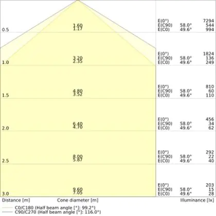 De lichtopbrengst (Lumen), geeft weer hoe krachtig het uitgestraalde licht is. Dit is belangrijk om te weten om de juiste sfeer te creëren. 0 tot 400 Lumen is bij uitstek geschikt voor accent- of sfeerverlichting. Een hoger aantal Lumen is, afhankelijk van de grootte van de ruimte, beter geschikt als ondersteunende- of basisverlichting. Heb je plafonds hoger dan 4 meter, dan is een lichtopbrengst van minimaal 8000lm aan te raden indien heldere verliching gewenst is (vb. in werkomgevingen).
